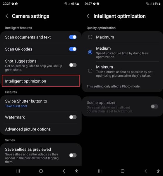 One UI 6.1.1 будет повторно выпущена для Galaxy S23 Ultra после того, как проблему исправят. Она, напомним, проявляется смазанными фото при съемке с зумом в диапазоне от 16x до 19,9x. Ну а пока есть два способа, которые позволяют обойти проблему. Первый — включить в настройках камеры функцию Intelligent optimization, а в ней выбрать средние настройки качества.