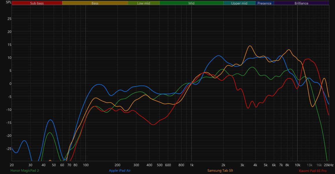 Honor MagicPad 2 предлагает несколько более громкое, а главное — сбалансированное и приятное звучание, чем два его ближайших конкурента: Apple iPad Air (M2) и Samsung Tab S9. При этом разницу сложно назвать по-настоящему значительной: с учетом работы встроенных «улучшайзеров» звучания, все три устройства могут обеспечить сравнительно эффектный звук, закрывающий потребности не слишком требовательного слушателя, как минимум — при просмотре видеоконтента. Немного позади остался лишь Xiaomi Pad 6S Pro, особенности звучания которого не в силах скомпенсировать ни эквалайзеры, ни автоматические системы корректировки тонального баланса.