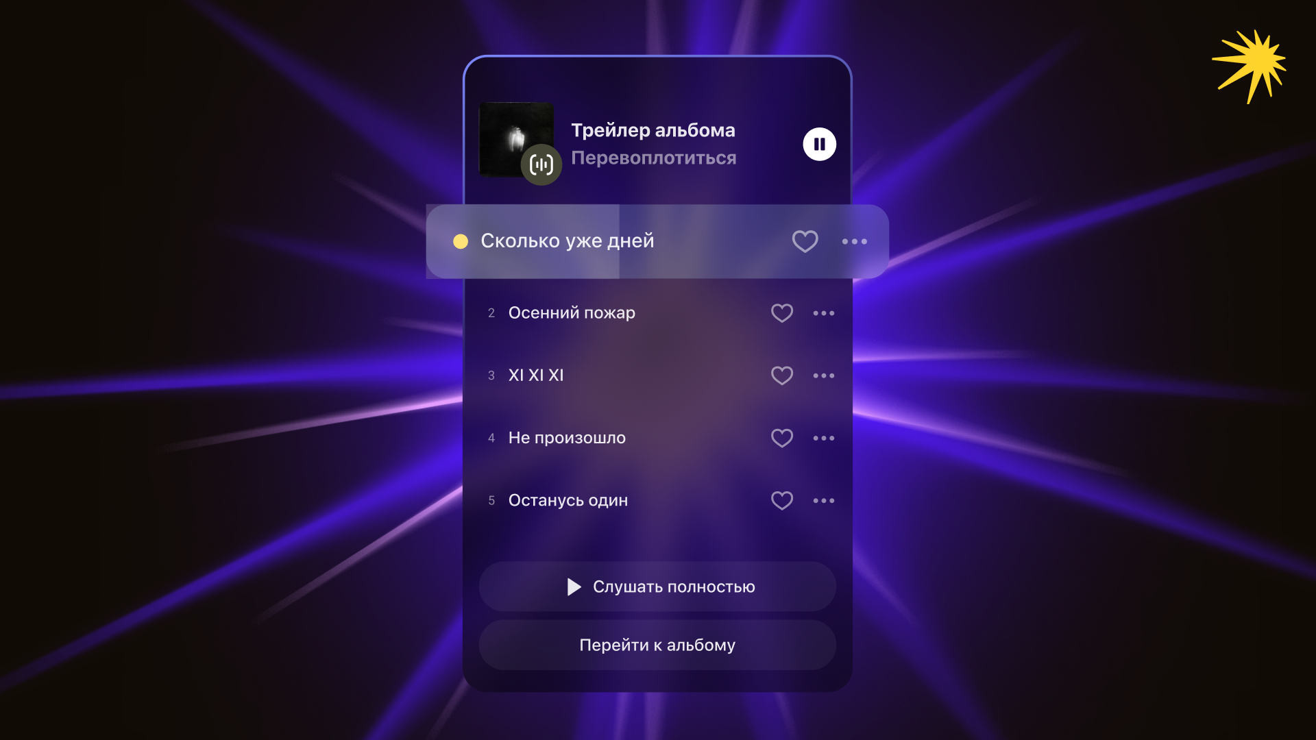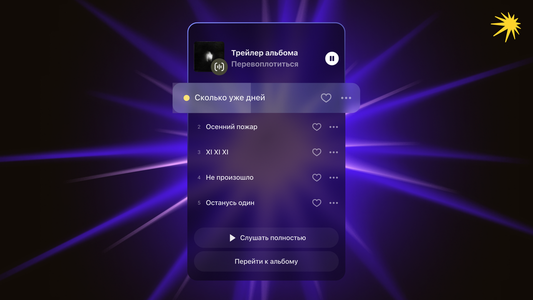 Трейлер можно запустить через кнопку на странице артиста, альбома или плейлиста, а также долгим нажатием на нужный контент в разных разделах приложения. Затем можно быстро перейти к прослушиванию всей композиции с помощью кнопки «Слушать полностью». Кроме того, любому треку из «Трейлеров» можно поставить «лайк» и тем самым сохранить понравившуюся музыку в «Коллекцию».