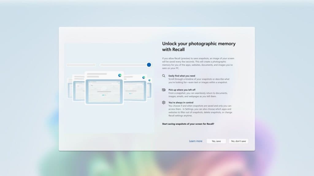 Microsoft акцентирует внимание на том, что Recall «является опциональным опытом», который вы выбираете при первой настройке ПК Copilot+. Проще говоря, никто вам её навязывать не будет, и Windows в самом начале даст возможность её отключить.