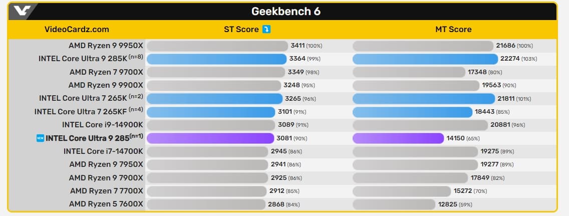 В бенчмарке CPU набирает 3081 и 14 150 баллов, и это намного меньше, чем у Core Ultra 9 285K, который набирает примерно 3350 и 22 300 баллов. Вполне вероятно, низкий результат обусловлен несерийным экземпляром.