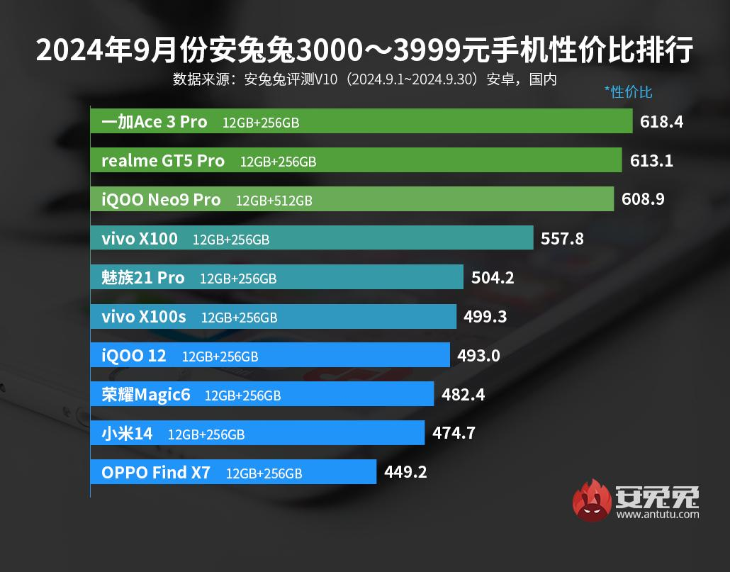 В следующей ценовой категории, от 3000 до 3999 юаней (от 427 до 568 долларов), первое место по-прежнему принадлежит OnePlus Ace 3 Pro, а второе и третье — Realme GT5 Pro и iQOO Neo9 Pro соответственно.