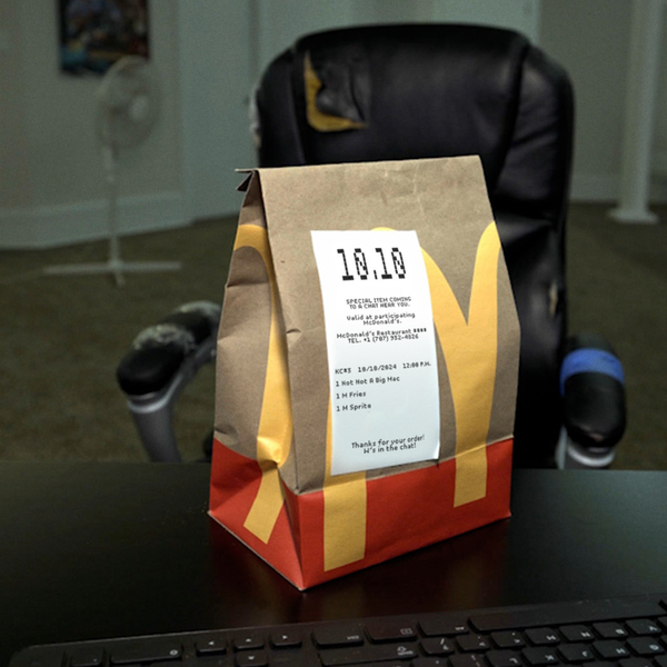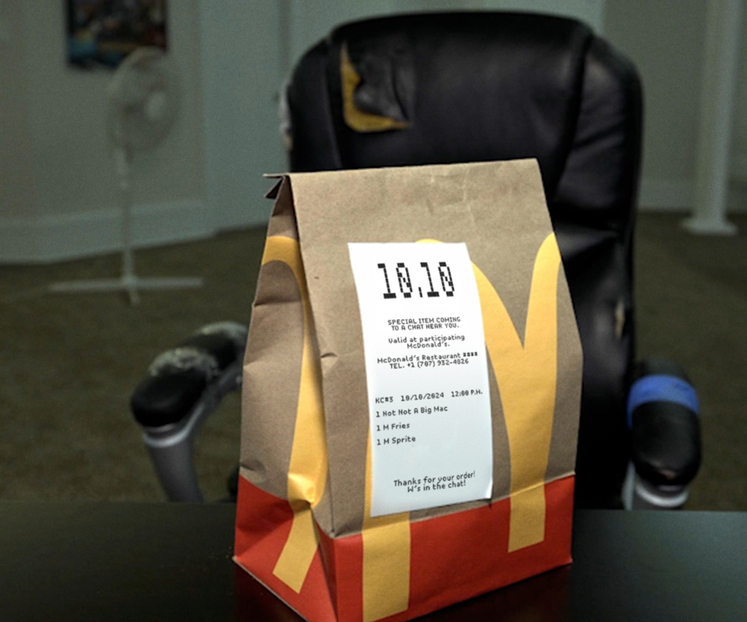 McDonald's опубликовал фотографию, на которой показан фирменный пакет с чеком. На чеке указаны дата и написано: «Специальный товар, который будет доставлен в чат рядом с вами».