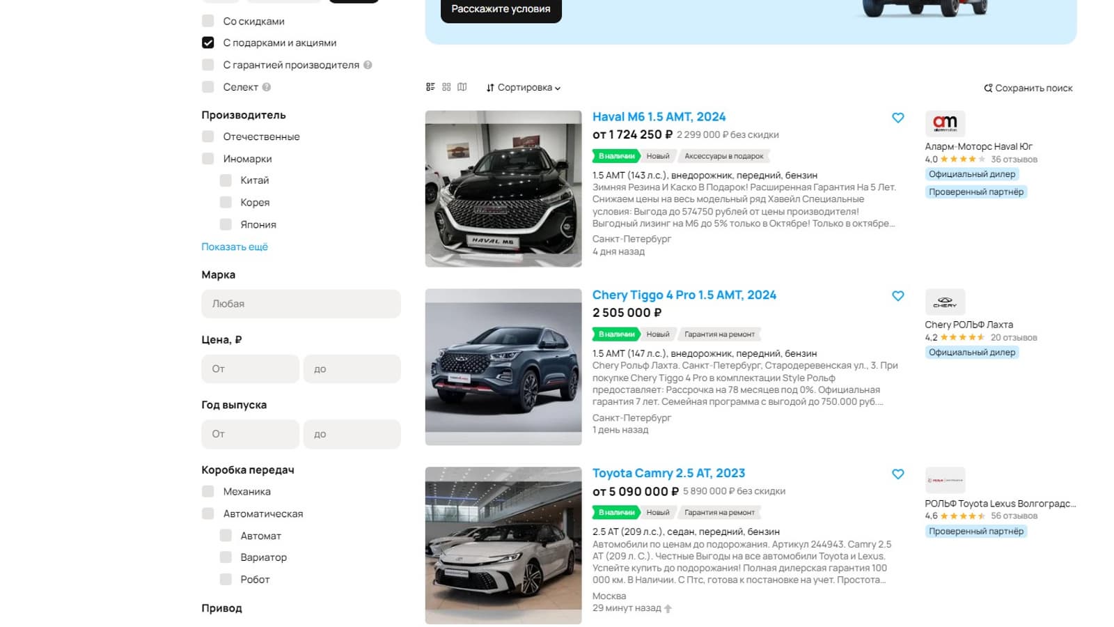 Пользователи могут фильтровать предложения по множеству параметров, включая не только стоимость и характеристики, но также условия гарантии и историю работы дилеров на платформе.