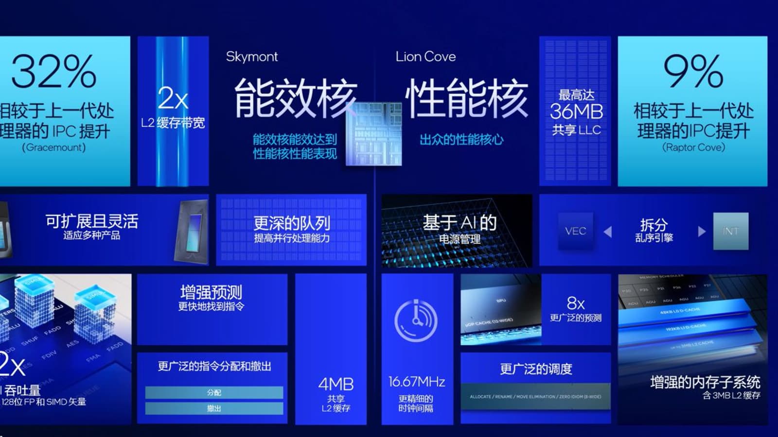 Согласно данным самой Intel, большие ядра Lion Cove имеют на 9% больший показатель IPC (количество исполняемых за такт инструкций), чем у Raptor Cove. Малые ядра Skymont в этом плане намного более впечатляющи и предлагают на 32% больший IPC.