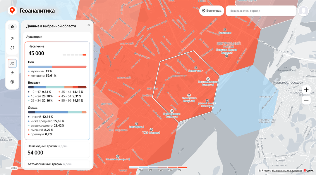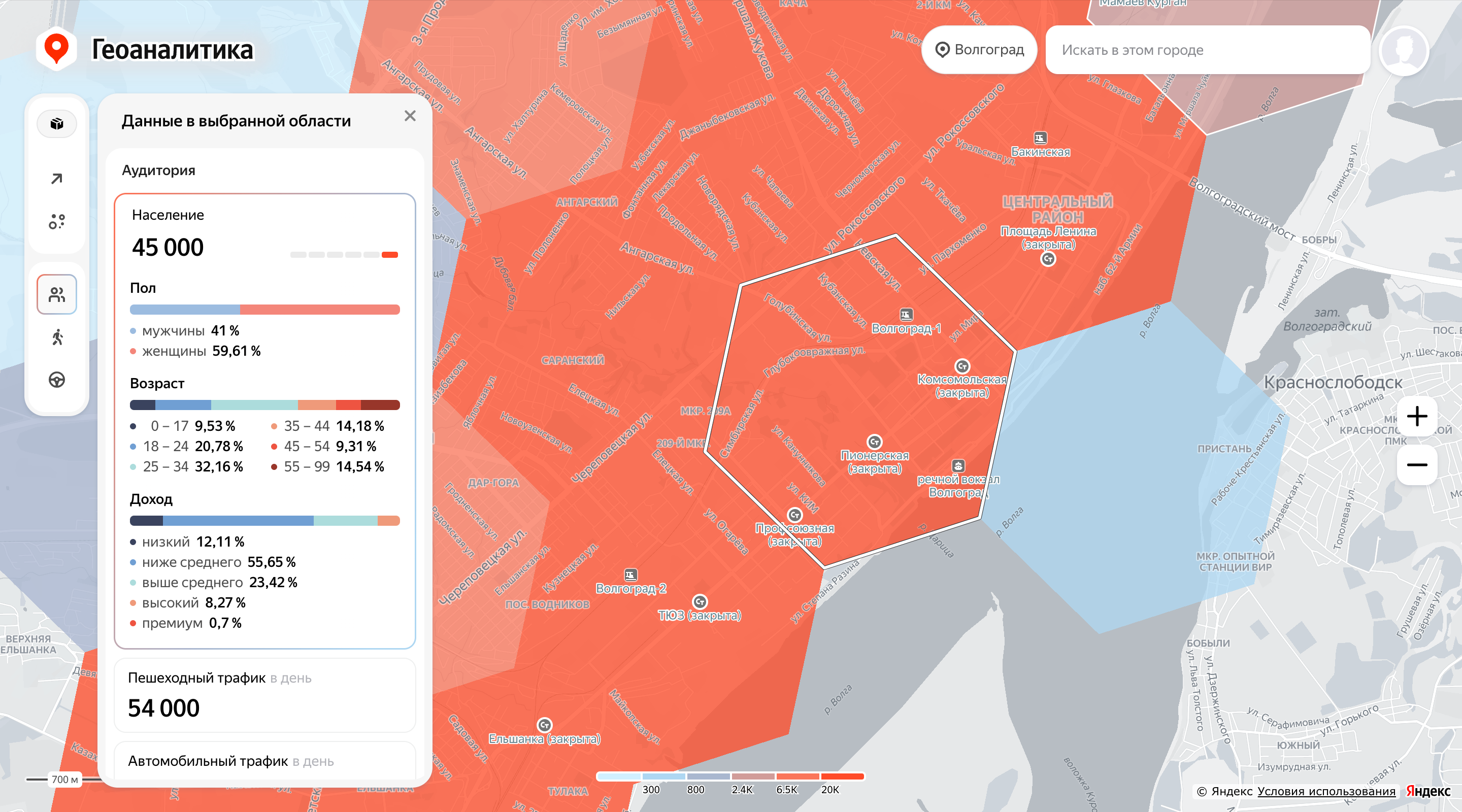 Геоаналитика будет полезна малому и среднему бизнесу, а также подойдёт крупным компаниям. Например, данные сервиса позволят выбрать локацию для открытия офлайн-бизнеса.