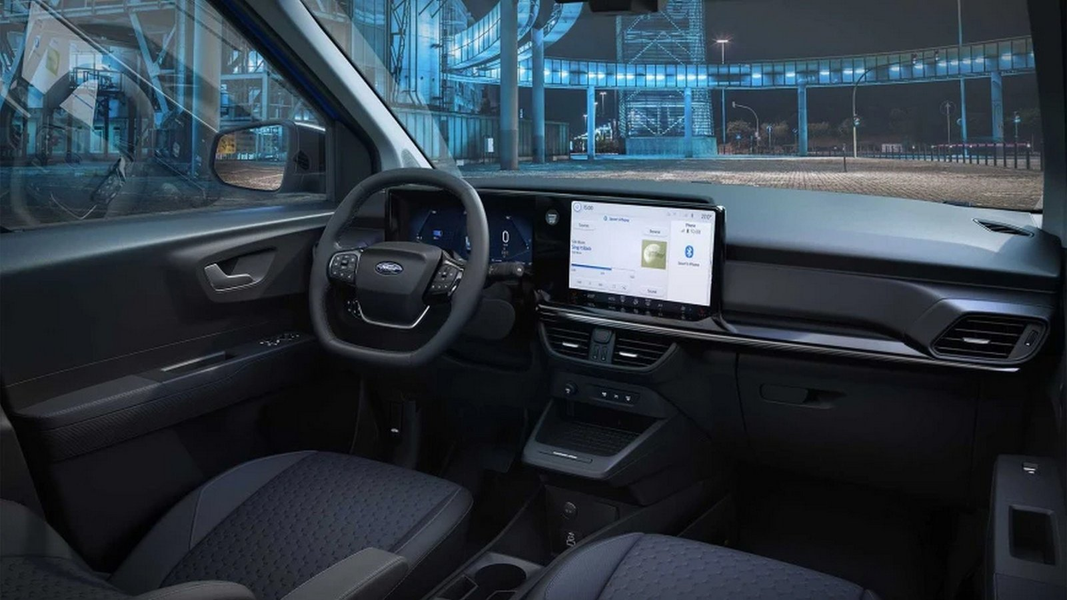 Внутри Ford E-Transit Courier получил приборную панель Digiboard, совмещенную с основным экраном. Суммарная диагональ составляет 24 дюйма.