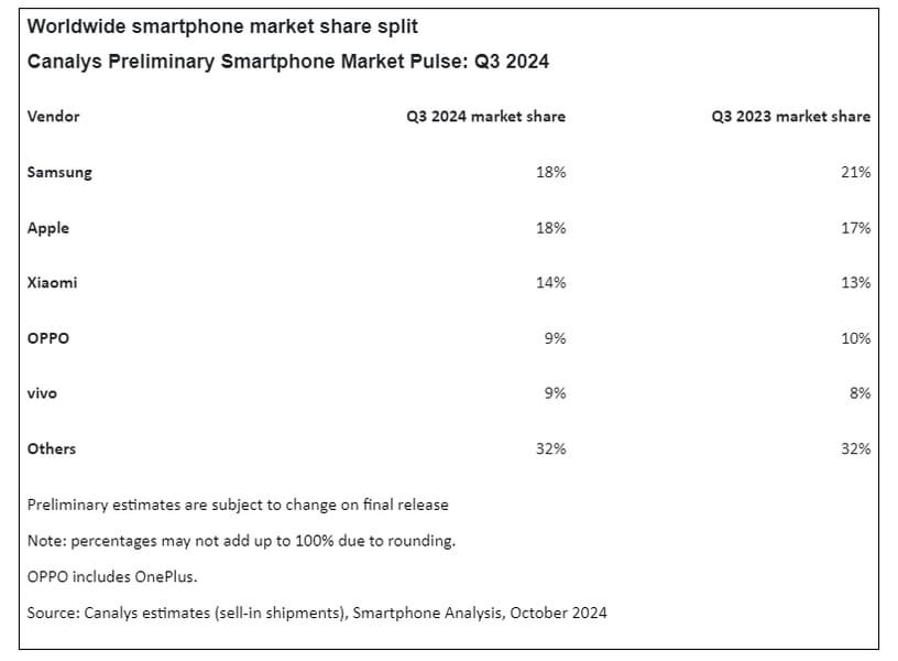 Аналитики Canalys оценили рынок смартфонов по итогам третьего квартала. Оказалось, что Samsung едва удержала лидерство.
