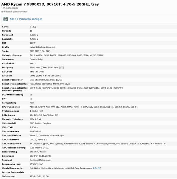 По данным Geizhals, продажи AMD Ryzen 7 9800X3D (как минимум в Германии) стартуют 7 ноября.
