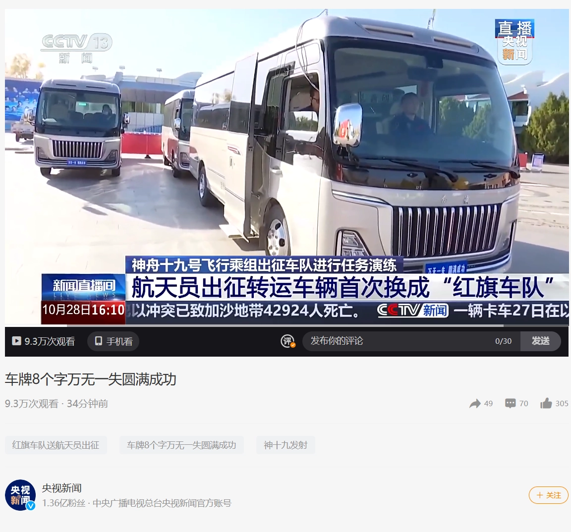 Китайский пилотируемый космический корабль «Шэньчжоу-19» должен быть запущен завтра, 29 октября. На стартовую площадку астронавтов впервые доставит автомобиль Hongqi Guoyue.