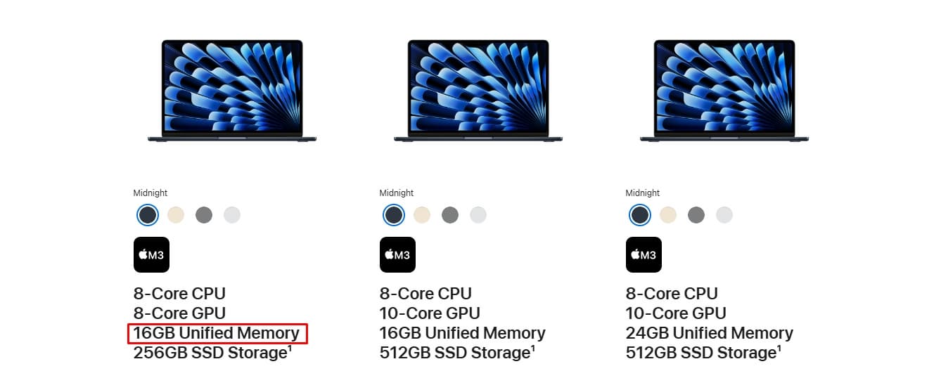 16 ГБ ОЗУ теперь в базе у любого Air из актуальной линейки. То есть и у более новых с SoC M3 и у более старой с SoC M2. Последняя всё так же стартует с 1000 долларов, но теперь с удвоенным объёмом оперативной памяти. Базовая модель с M3, как и ранее, стоит 1100 долларов.