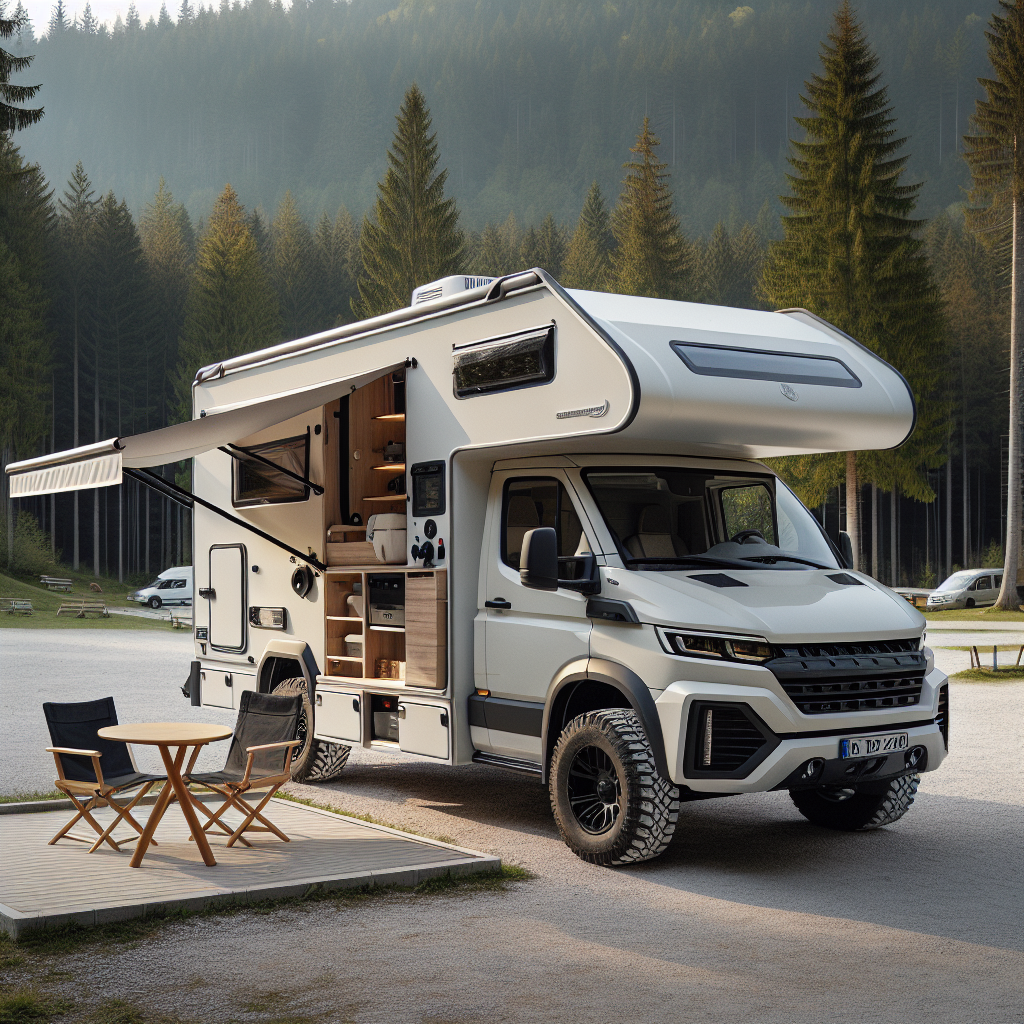 Предусмотрены четыре спальных места, в том числе двуспальная кровать над кабиной. Есть бак для чистой воды объемом 300 литров, бак для серой воды, датчики задымления и угарного газа, на всех окнах предусмотрены москитные сетки и жалюзи, снаружи — тент-маркиза с электроприводом.