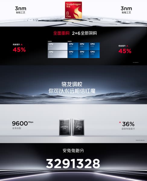 В Китае идет презентация смартфонов новой линейки Red Magic 10. В ходе нее были озвучены результаты производительности флагманской модели серии в AnTuTu: Red Magic 10 Pro набирает в бенчмарке 3,29 млн баллов. Ни один из уже представленных флагманов на Snapdragon 8 Elite или Dimensity 9400 на такое не способен — их производительность не дотягивает до 3,1 млн баллов.