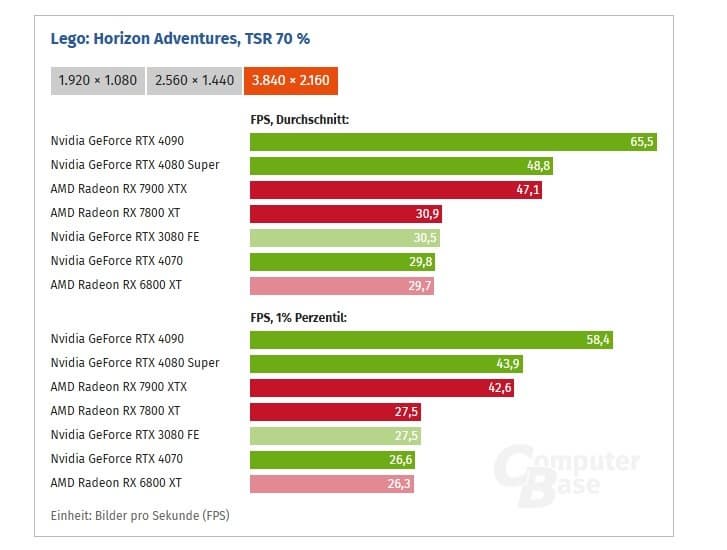 Тесты показывают, что в 4K при максимальных настройках качества графики даже GeForce RTX 4090 выдаёт лишь немногим более 60 к/с, а уже RTX 4080 обеспечивает только 49 к/с. Radeon RX 7900 XTX выступает на том же уровне — 47 к/с.
