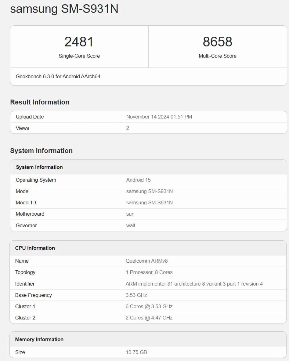 В бенчмарке протестировали Galaxy S25 для рынка Южной Кореи — смартфон обозначен каталожным номером SM-S931N. Аппарат работает под управлением Android 15, в основе аппаратной платформы лежит Snapdragon 8 Elite, однако производительность далеко не рекордная: 2481 балл в однопоточном тесте и 8658 баллов в многопоточном.