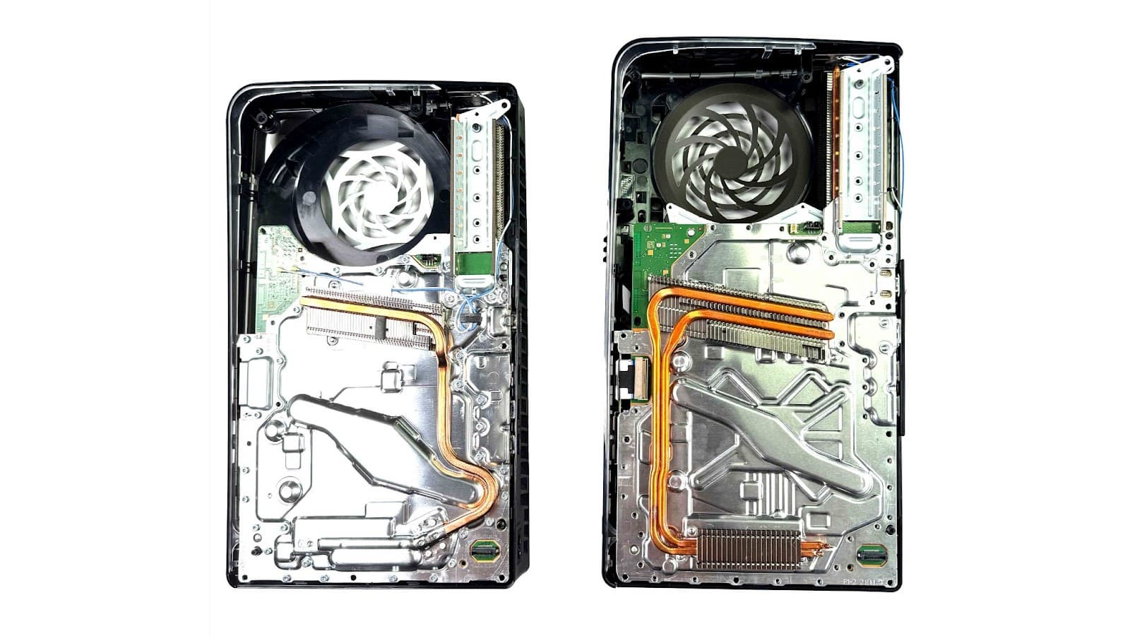 Также можно наглядно увидеть разницу в системах охлаждения между PS5 Pro и PS5 Slim.