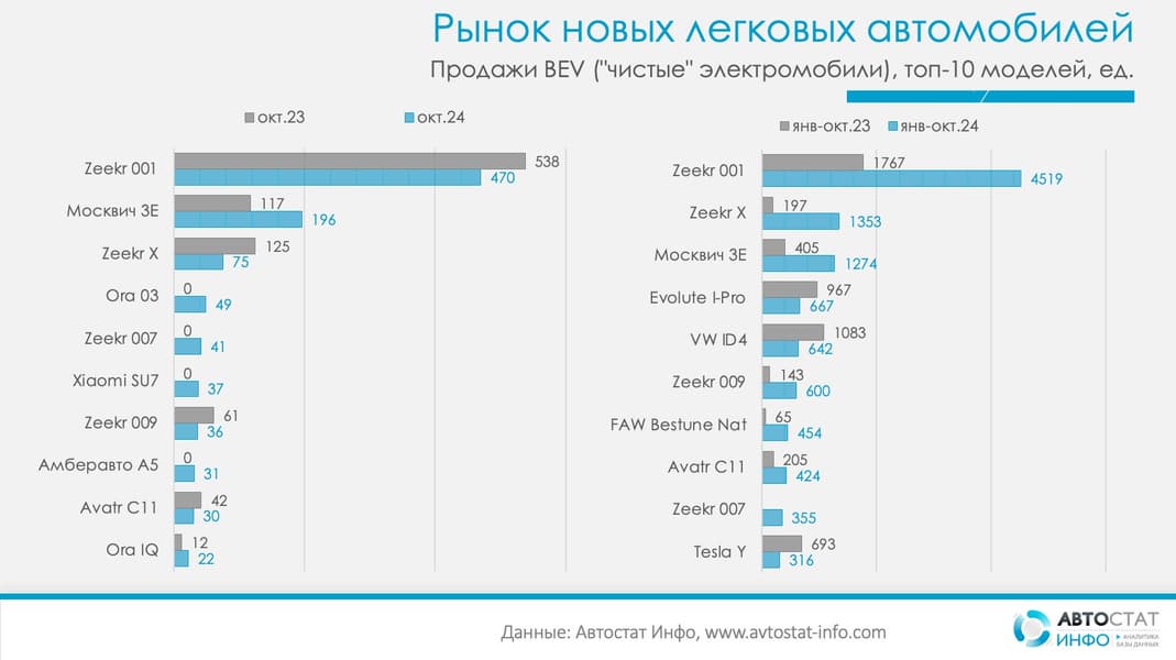 В октябре бестселлером остался Zeekr 001, продажи которого сократились с 740 до 538 машин. «Москвич 3Е» показал рост продаж со 117 до 196 ед. и занял второе место. Замыкает топ-3 рейтинга Zeekr X, продажи которого сократились со 125 до 75 ед.