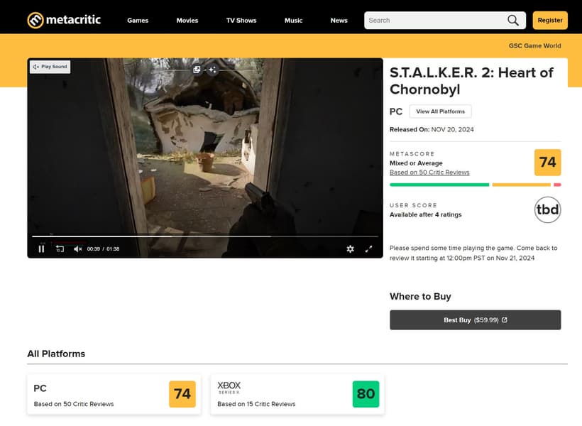 Отзывов об игре в Steam пока нет, но есть оценка критиков — 74 балла из 100. S.T.A.L.K.E.R. 2: Heart of Chornobyl хвалят за неповторимую атмосферу, интересный и разнообразный мир, сюжет и графику. В минусах — многочисленные баги, лаги и далеко не самый умный ИИ.