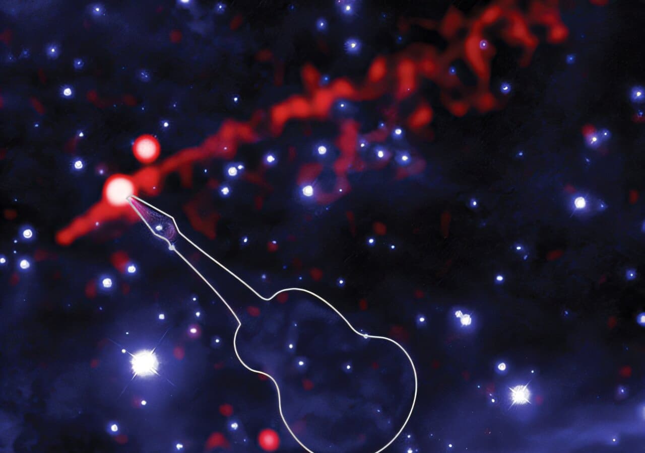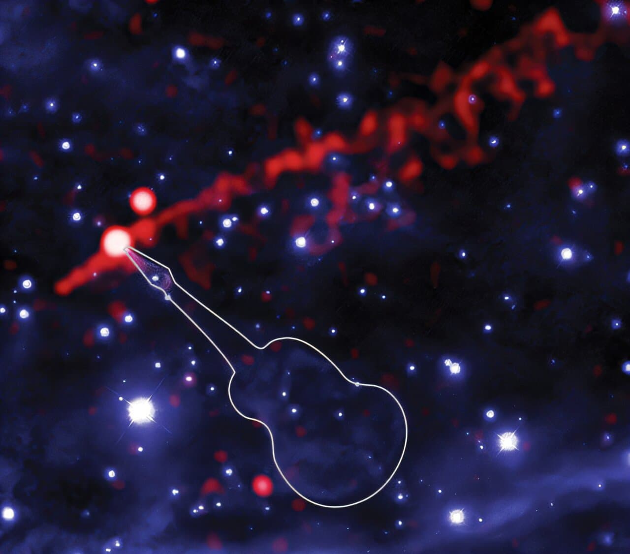 Астрономы обнаружили уникальный космический объект, получивший название туманность «Гитара», который представляет собой длинную нить из энергичной материи и частиц антиматерии, вылетающую из пульсара PSR B2224+65. Этот объект был обнаружен с помощью рентгеновской обсерватории «Чандра» и космического телескопа «Хаббл».