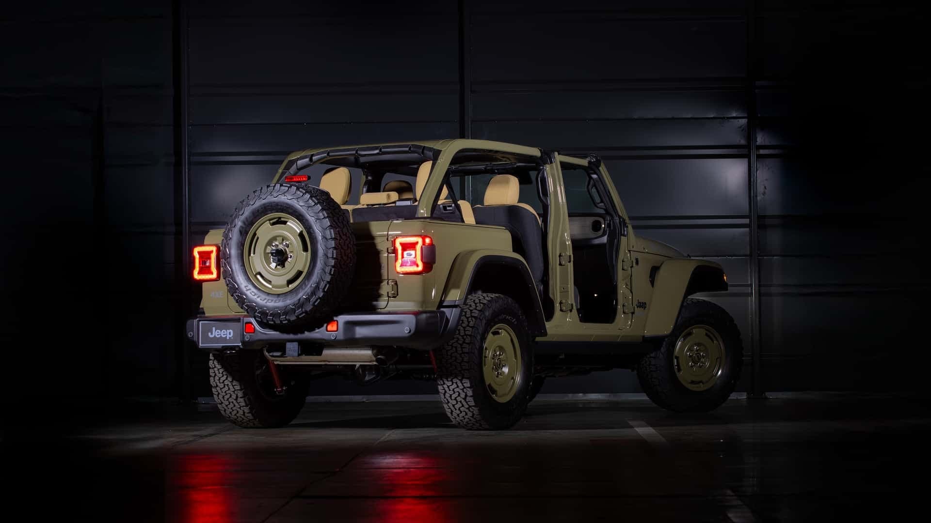 Wrangler 4xe Willys '41, созданный на основе подключаемой гибридной модели, является данью уважения легендарному армейскому автомобилю. Он предлагается только в военной оливковой окраске, отсылающей к Willys MB. Jeep покрасил 17-дюймовые легкосплавные диски, которые в стандартной комплектации оснащены 33-дюймовыми вездеходными шинами. Наклейки в армейском стиле в цвете Drab Blue напоминают те, которые использовал его предшественник во время Второй мировой войны.