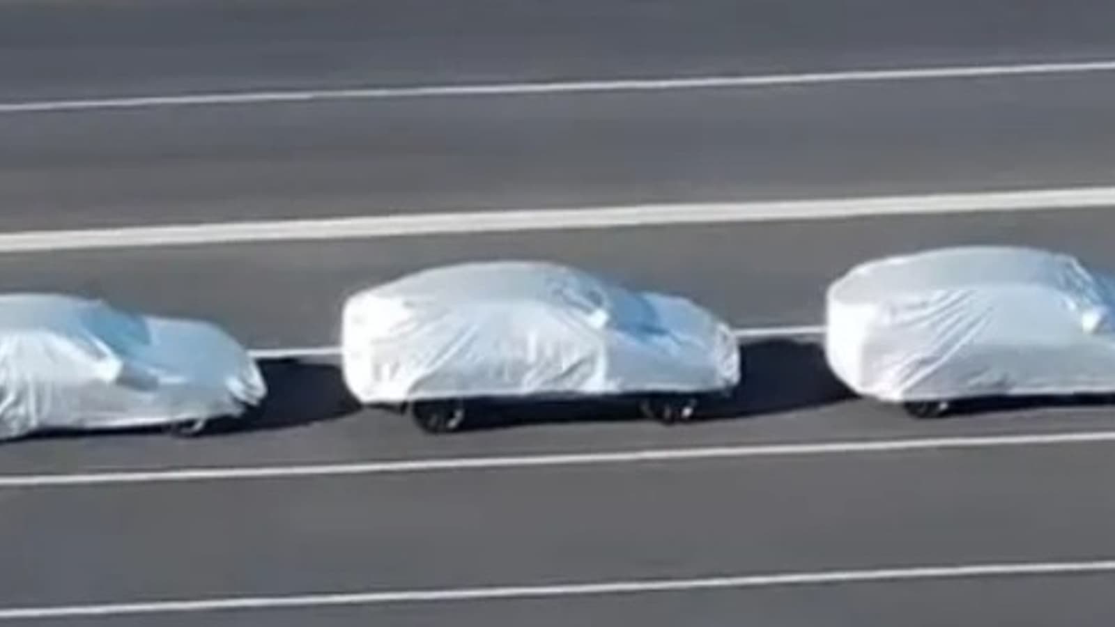 На кадрах с воздуха видно, что эти восемь машин покрыты серебристо-белой тканью, при этом автомобили явно имеют разный дизайн.