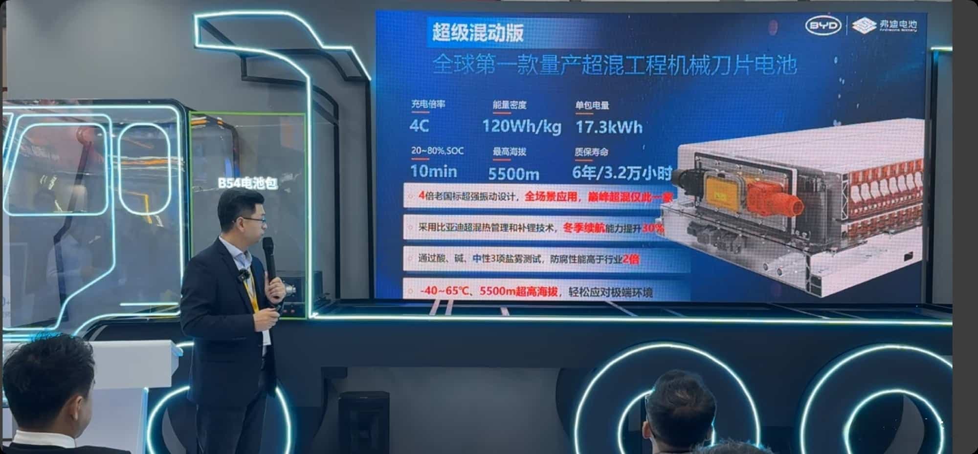 Утверждается, что это первый серийно выпускаемый аккумулятор CTB для строительной техники. Одним из важных факторов для строительной техники и коммерческих транспортных средств является вибрация. Аккумулятор может выдерживать вибрацию, в 6 раз превышающую интенсивность старого национального стандарта.