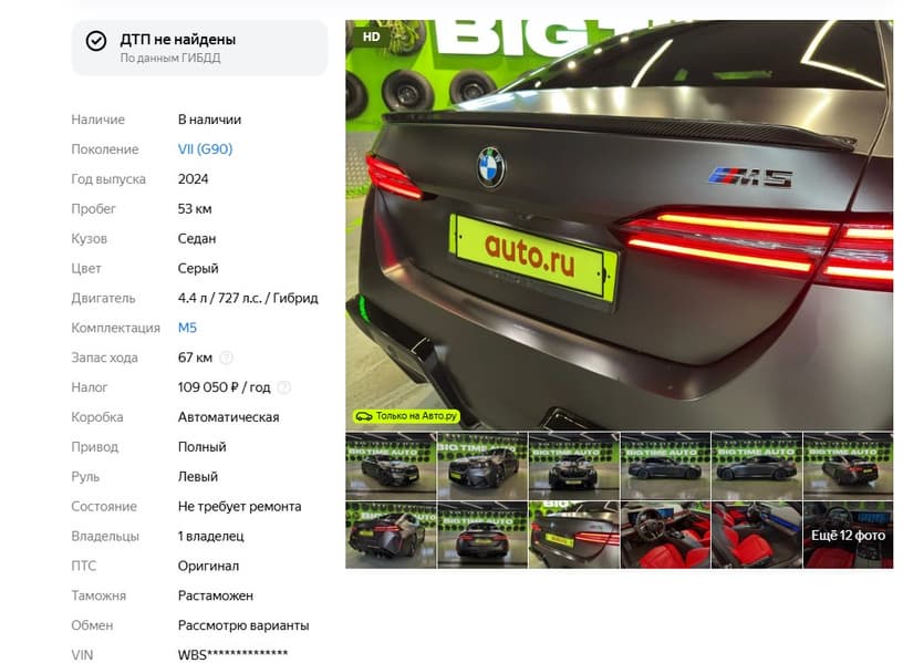 В Москве в продаже появился первый экземпляр BMW M5 2024 года выпуска, который предлагают за 30 млн рублей. Полноприводный седан VII поколения оснащен двигателем мощностью 727 л.с. и объемом 4,4 л, а также с автоматической коробкой передач.