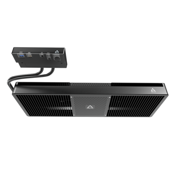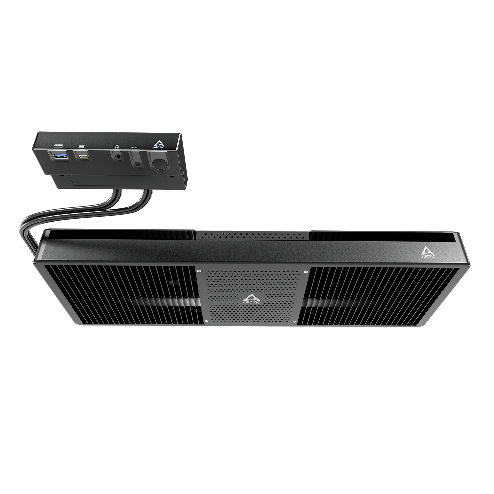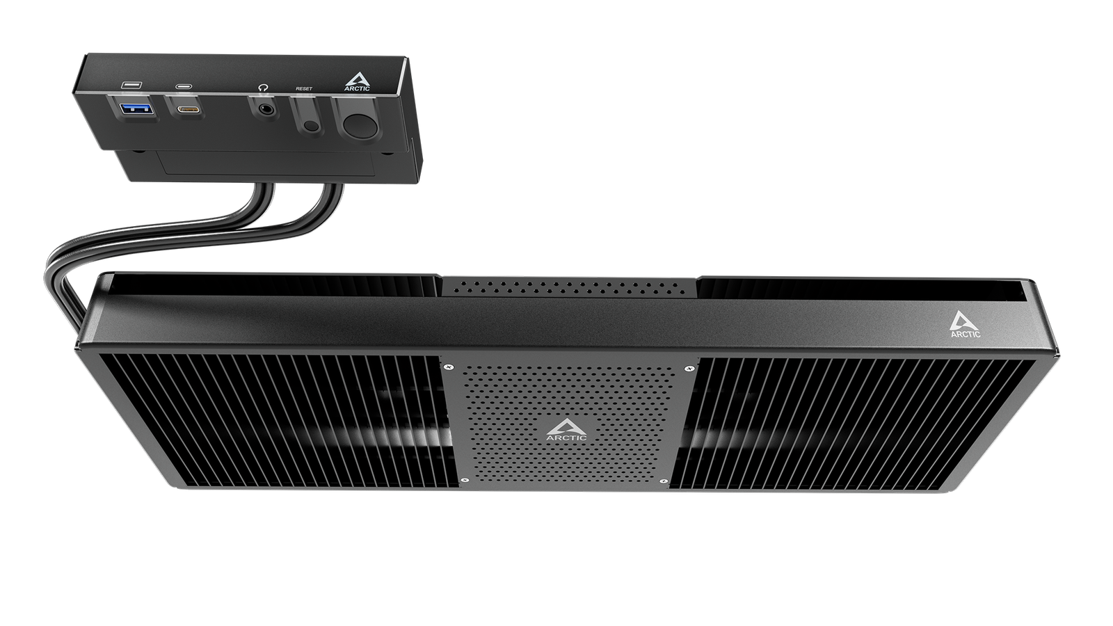Arctic создала его таким, чтобы пользователи могли спрятать его под крышкой стола! Для удобства есть выносной блок с рядом портов: USB, USB-C, 3,5 мм. Там же размещены кнопки питания и перезагрузки. Сам же ПК предлагает также два USB 2.0, два USB 3.2, HDMI, DisplayPort, RJ45.