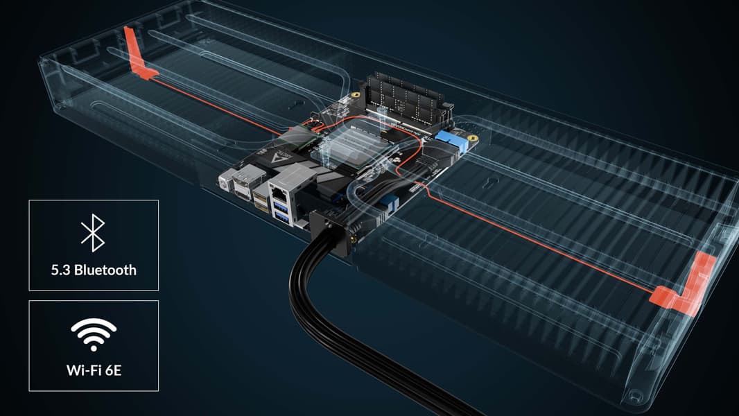 Как можно видеть на изображениях, сам ПК размещён на очень компактной плате. Фактически это одноплатный ПК с оговорками. Эта плата буквально помещена внутрь огромного радиатора, который должен всё это охлаждать. ПК получается тонкий, но весьма габаритный, если мы говорим о площади: 536 х 180 х 50 мм. И это неспроста.