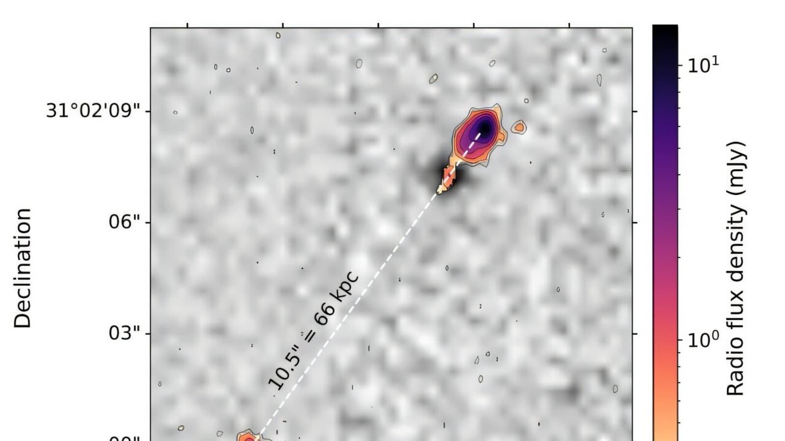 Международная группа астрономов, возглавляемая Анниек Джоан Глоудеманс из обсерватории Gemini, обнаружила чрезвычайно протяжённый радиовыброс в квазаре J1601+3102, используя данные низкочастотной решетки (LOFAR) и спектрографа Gemini Near-Infrared Spectrograph (GNIRS).