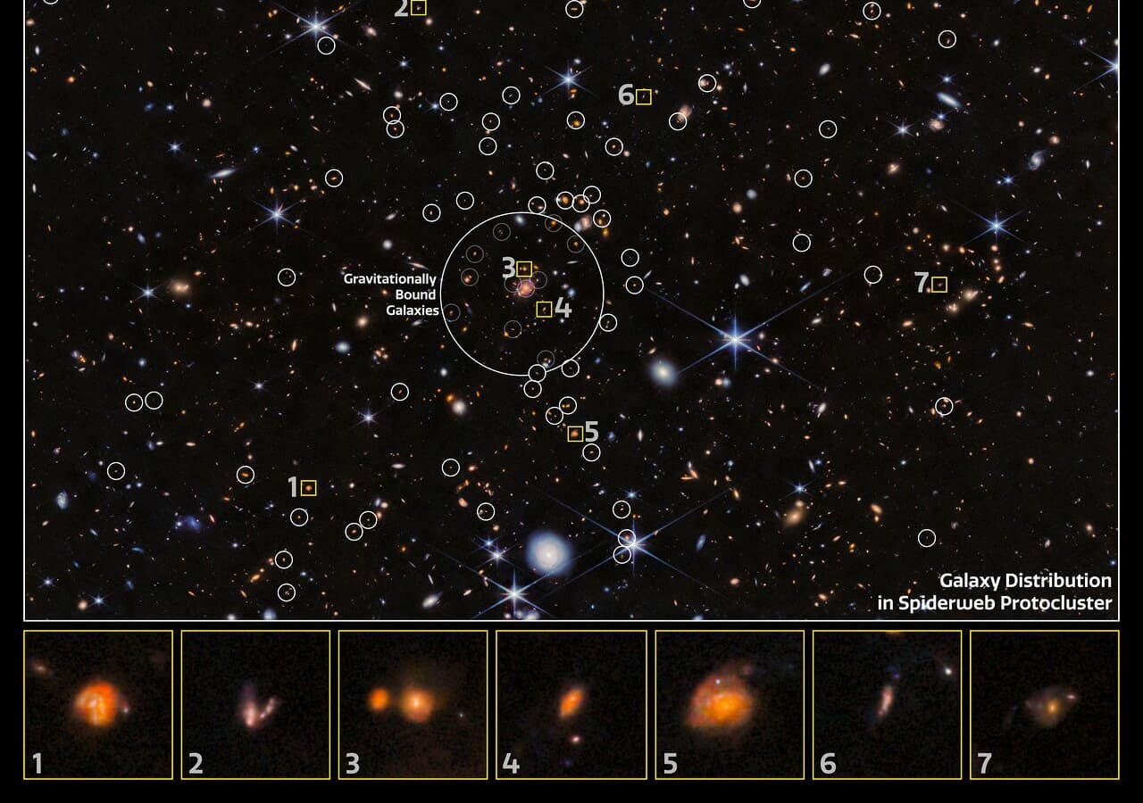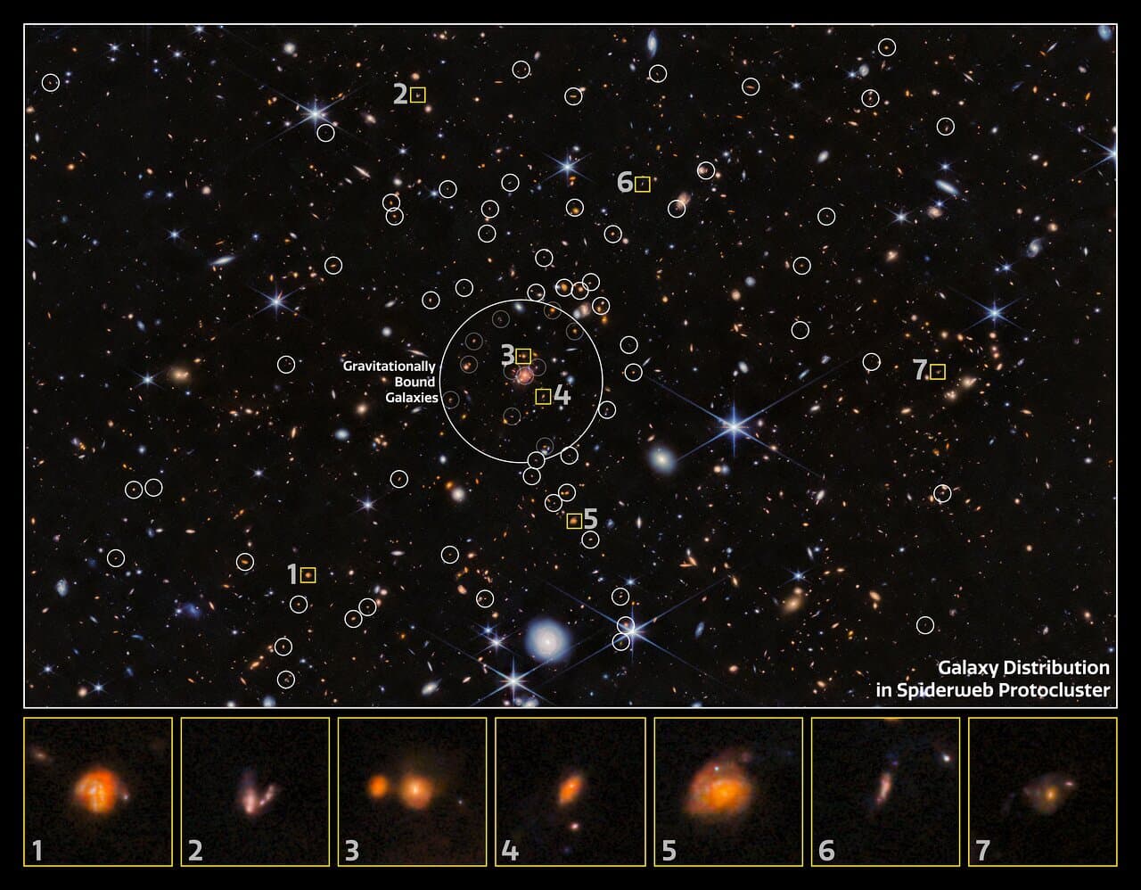 Протокластер Spiderweb, расположенный на расстоянии более 10 миллиардов световых лет от Земли, представляет собой галактическое скопление в процессе формирования, состоящее из более чем сотни известных галактик. Астрономы изучают такие крупномасштабные структуры, чтобы лучше понять формирование галактик и влияние их окружения.