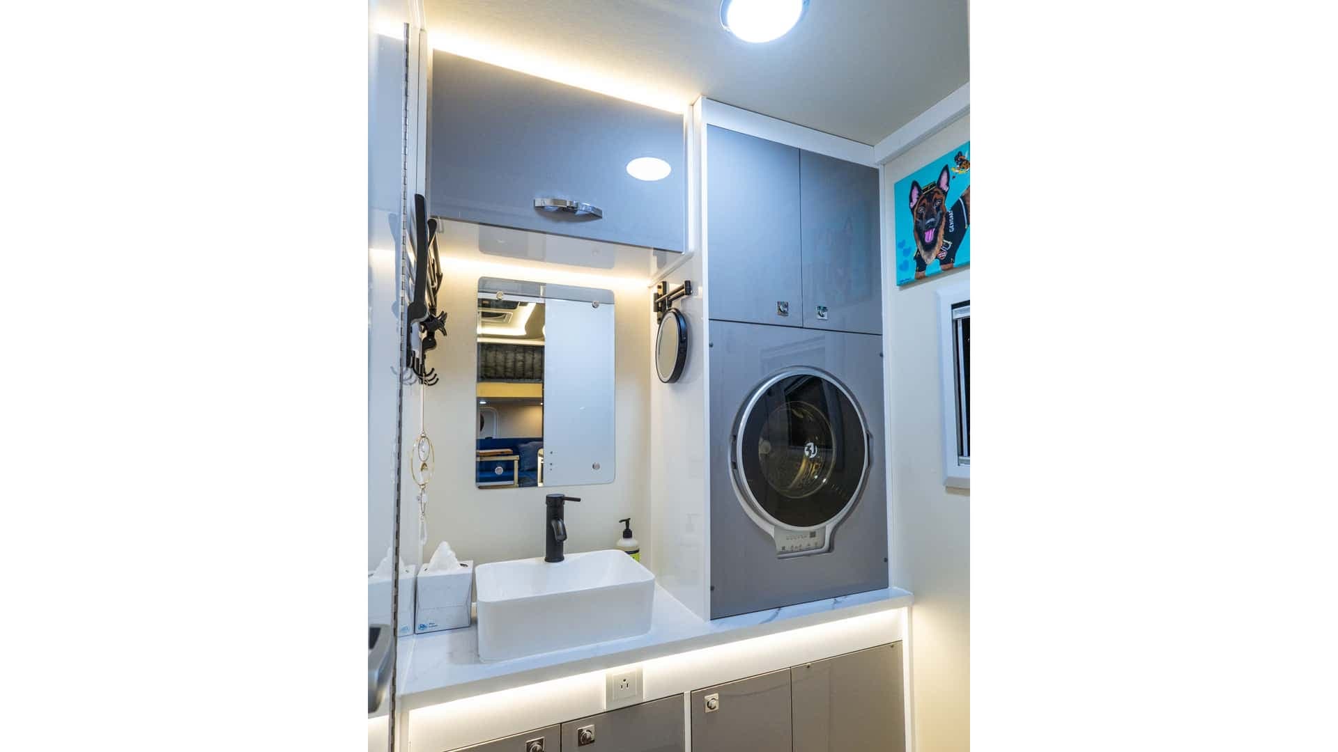 Предусмотрены наружный и внутренний душ, стиральная и сушильная машина. Sherpa перевозит 455 л пресной воды, работает на системе Victron Energy с батареями 800 А•ч, а на крыше установлены солнечные панели мощностью 1000 Вт для зарядки.