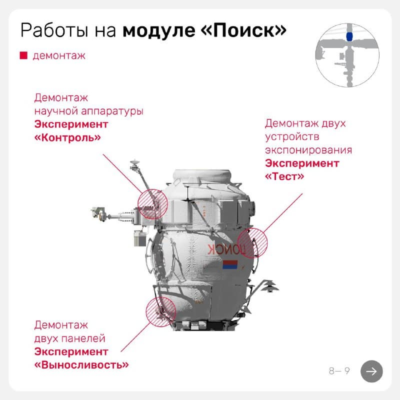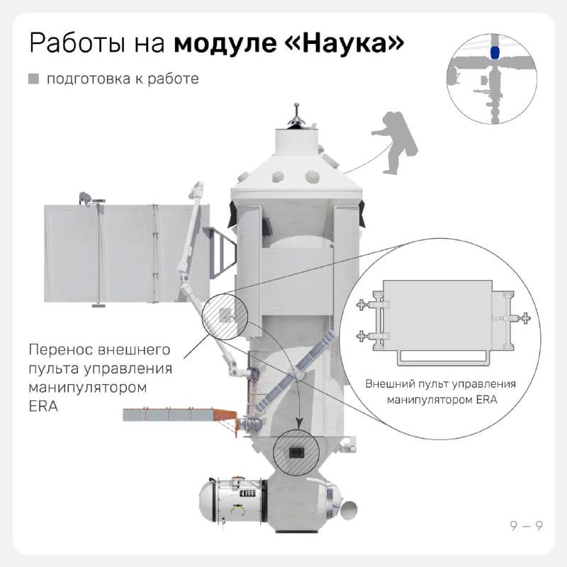 После этого космонавты перенесут с одного места на другое внешний пульт управления EMMI роботизированной рукой-манипулятором ERA на модуле «Наука». И в конце ВКД Алексей Овчинин оттолкнёт в космос укладку с демонтированными старыми фиксирующими платами, защитными чехлами с рентгеновского спектрометра и научной аппаратурой «Индикатор-МКС».