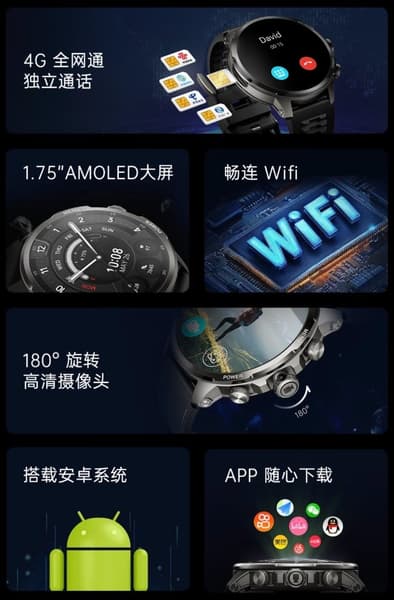 Часы работают на базе операционной системы Android (версия не указана) и оснащены 4 ГБ оперативной и 32 ГБ встроенной флеш-памяти. В оснащение входят датчики сердечного ритма и уровня кислорода в крови, а также поддержка 4G и SIM-карт, а также Wi-Fi.