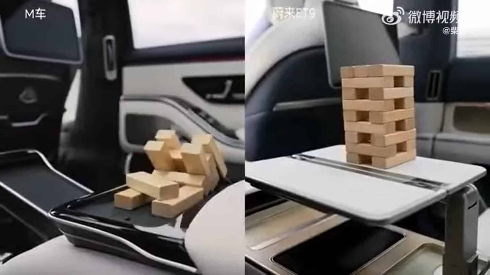 На видео можно увидеть, как Nio ET9 и Maybach S-class едут в колонне на одной скорости через препятствия в виде лежачих полицейских. Внутренняя камера, следящая за башней Jenga, показывает, что в случае Maybach башня вскоре рушится, тогда как в случае Nio башня остается невредимой. Внешнее видео показывает, что кузов Maybach сильно раскачивается, тогда как в случае ET9 он остается устойчивым.