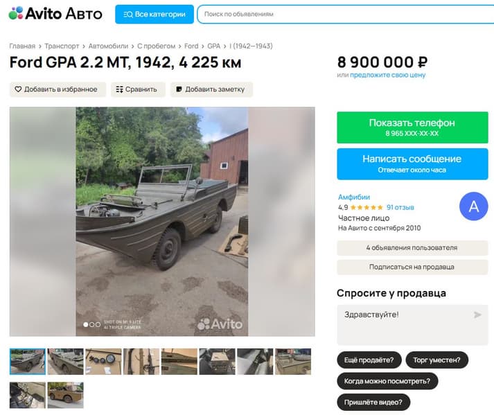 Частный продавец из Лобни выставил на продажу уникальный раритет времен Второй мировой войны: это плавающий внедорожник Ford GPA, поставлявшийся в СССР во время войны по ленд-лизу. По словам нынешнего владельца, машина на ходу и отреставрирована на 75-80%. Учитывая, что автомобиль был выпущен в 1942 году, состояние можно назвать очень хорошим. Пробег невелик — всего 4225 км. Просят за машину 8,9 млн рублей.
