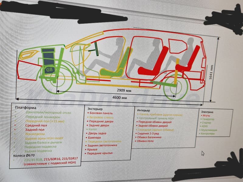 Изображение раскрывает ключевые параметры машины — длину и колесную базу. Габаритная длина составляет 4,6 метра, но колесная база при этом — внушительные 2909 мм (на 60 мм больше, чем у Lada Aura и на 85 мм больше, чем у Toyota Camry XV80). В таком довольно просторном салоне разместятся три ряда сидений для семи человек.