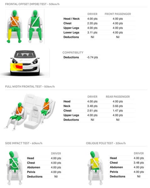 Защита водителя и пассажира — 85% (34,39 балла из 40). При фронтальном ударе на скорости 50 км/ч водитель испытывает высокие нагрузки на грудь и правую голень, но пассажир защищен хорошо. Защита детей — на 89% (43,62 из 49 баллов). Защита пешеходов — 84%, работу систем помощи водителю оценили в 82%.