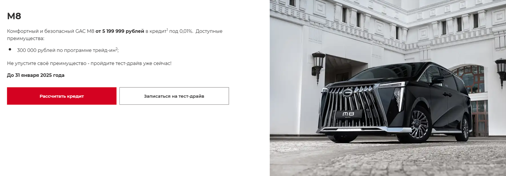 Согласно информации, указанной на официальном сайте, до 31 января модель предлагается за 5,2 млн рублей при оформлении кредита под 0,01%, при этом действует скидка 300 000 рублей по трейд-ин.