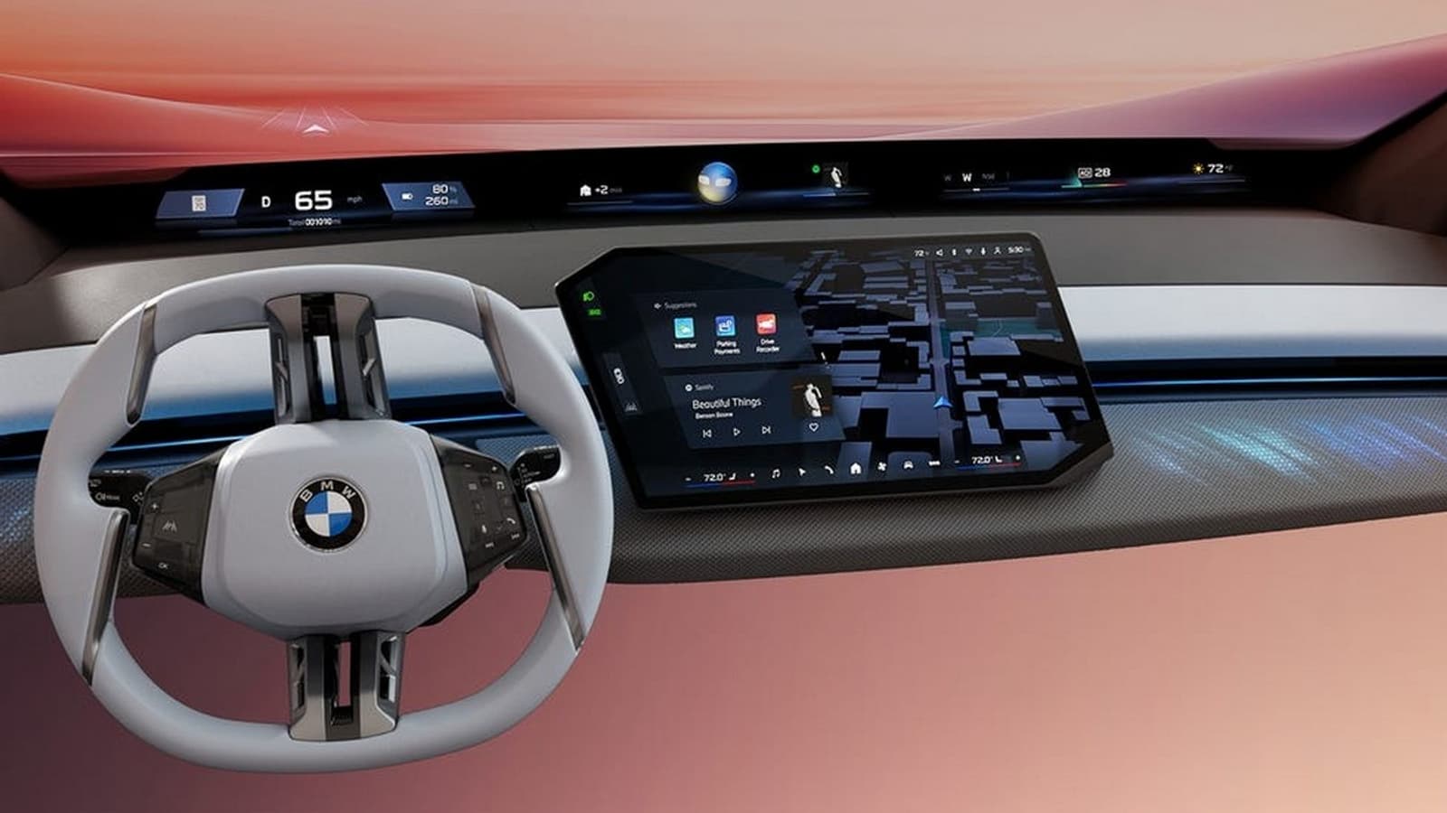 Система получила название BMW Panoramic iDrive. Как и в концепт-каре, новая система оснащена панорамным дисплеем, охватывающим всю приборную панель, в сочетании с центральным экраном и опциональным проекционным дисплеем на лобовом стекле. Компания описывает многофункциональное рулевое колесо как новую часть системы благодаря добавленной тактильной чувствительности.