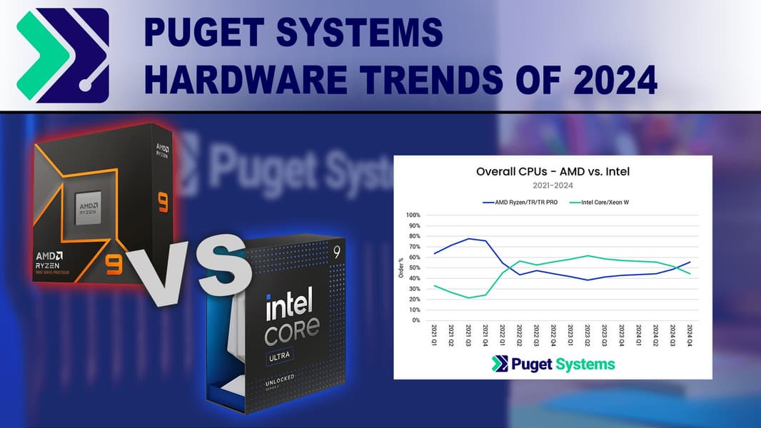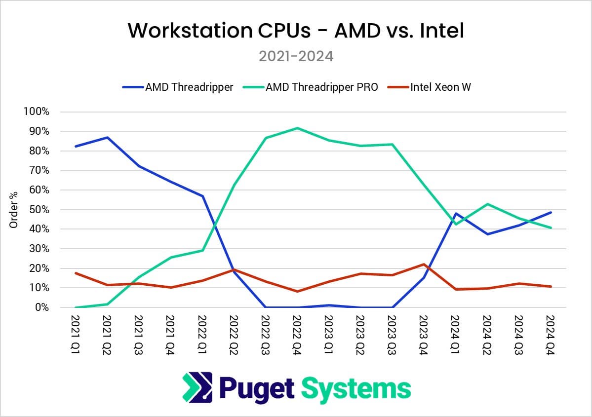 Компания Puget Systems, которая является довольно крупным игроком на рынке готовых ПК, причём для разных сегментов, поделилась свежей статистикой относительно выбора процессоров. И статистика эта показывает, что AMD снова набирает обороты.
