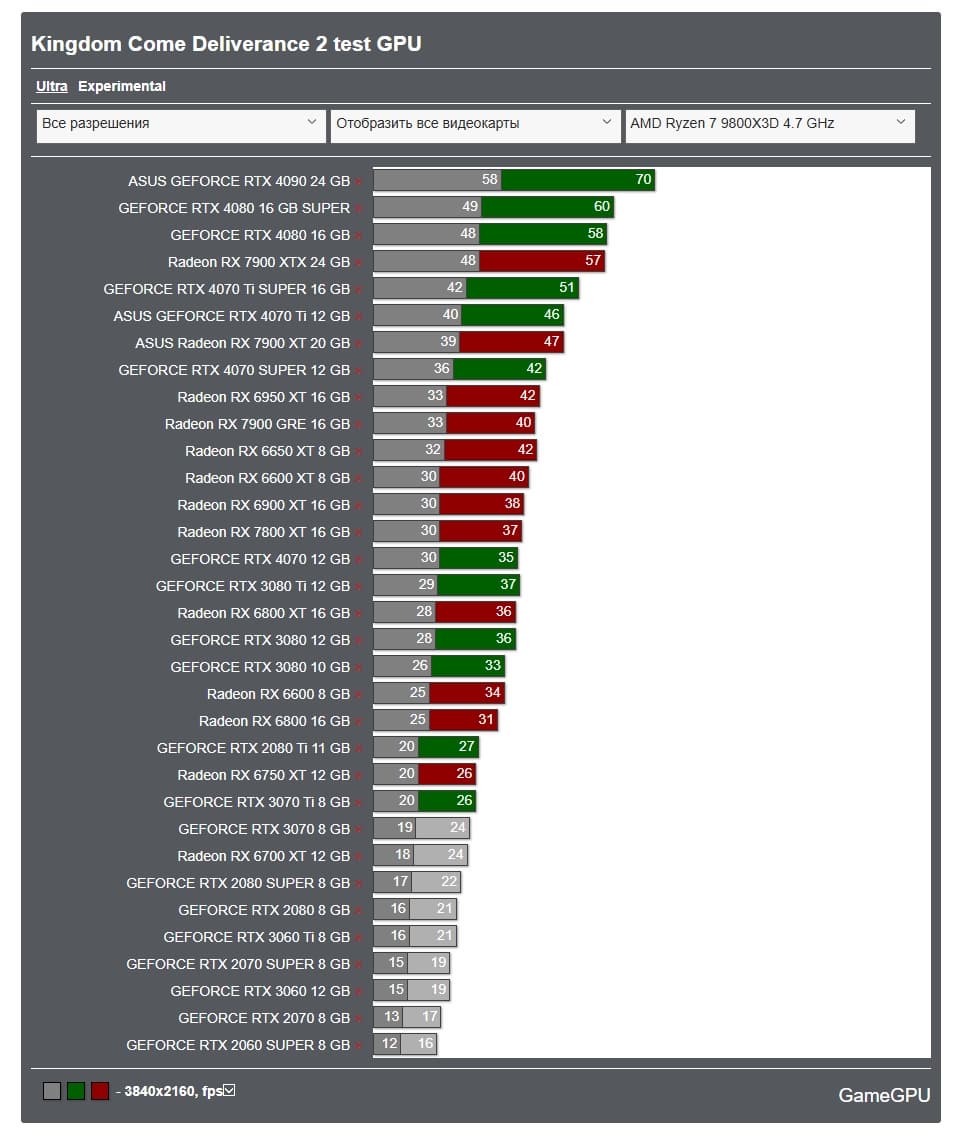 В 4K нагрузка ожидаемо намного выше. RTX 4090 без апскейлеров способна выдать 70 к/с, а для 30 к/с нужна карта уровня RTX 3080. Включение DLSS позволяет поднять производительность настолько, что 30 к/с демонстрирует уже RTX 3070, а 60 к/с обеспечит RTX 4070 Super.