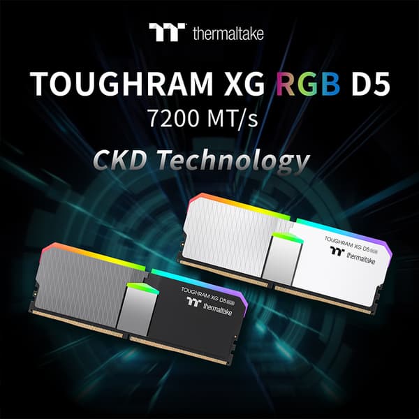 Новинка называется TOUGHRAM XG RGB D5. Это набор из двух модулей объёмом по 16 ГБ каждый, и это DDR5-7200. Модуль CKD (Clock Driver) отвечает за регенерацию тактового сигнала, управляющего чипами памяти. Генерируя чистые тактовые частоты локально на памяти (вместо того, чтобы напрямую использовать тактовые частоты от CPU), модули обеспечивают улучшенную стабильность и надежность на высоких частотах памяти.