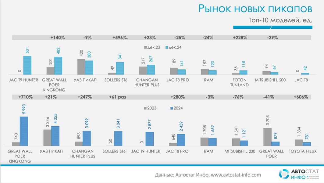 Самым популярным пикапом у россиян стал Great Wall Poer Kingkong: в прошлом году продано 5993 автомобиля против 740 единиц в 2023 году — в годовом выражении продажи этой модели взлетели в 8 раз. Почетное второе место закрепил за собой УАЗ «Пикап», разошедшийся в количестве 4055 единиц (рост продаж относительно прошлого года на 21%). На третьем месте расположился Changan Hunter Plus с продажами в количестве 3099 единиц (и эта модель показала внушительный рост спроса — на 247% в годовом выражении).