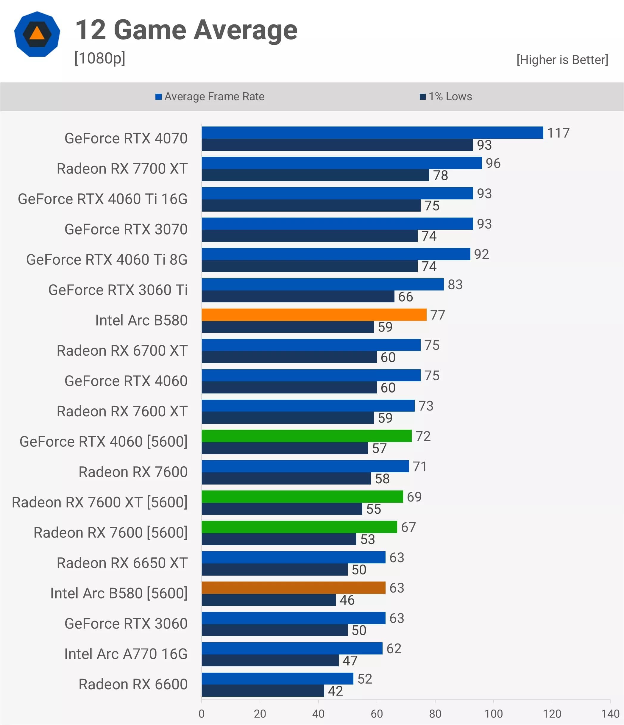 По итогу в Full HD с топовым процессором Arc B580 на 2% быстрее RTX 4060 и на 10% быстрее RX 7600, а со старым новинка Intel уже на 8% медленнее RTX 4060 и примерно на уровне RX 7600. Учитывая, что такие видеокарты редко покупают в пару с новейшим и мощным CPU, это потенциальная проблема для карты Intel.