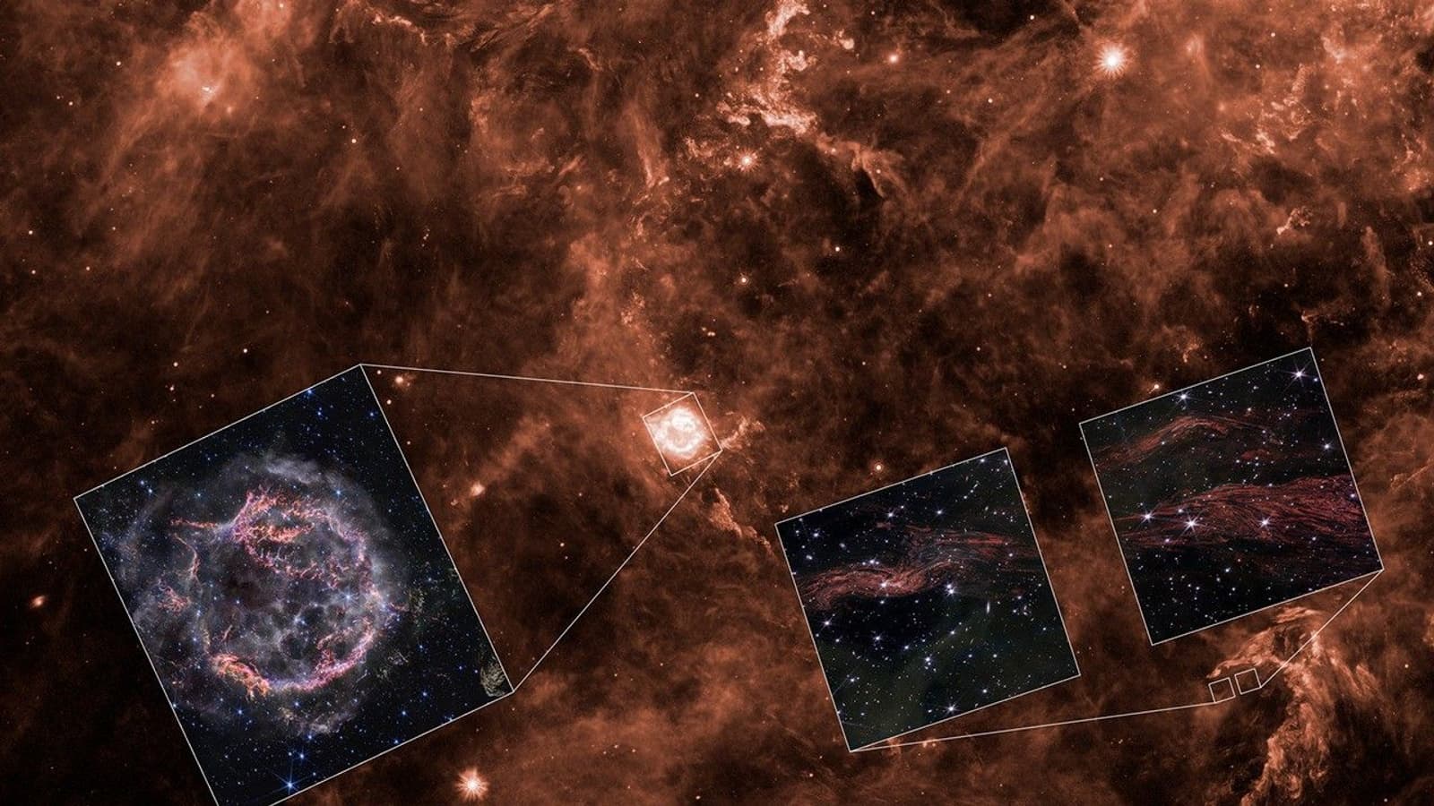 Изображение: NASA/JPL-Caltech/Y. Kim (Univ. of Arizona/Univ. of Chicago), ESA, CSA, STScI, Danny Milisavljevic (Purdue University), Ilse De Looze (UGent), Tea Temim (Princeton University). Light Echoes Inset: NASA, ESA, CSA, STScI, J. Jencson (Caltech/IPAC)