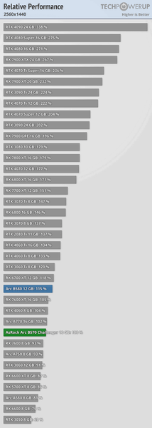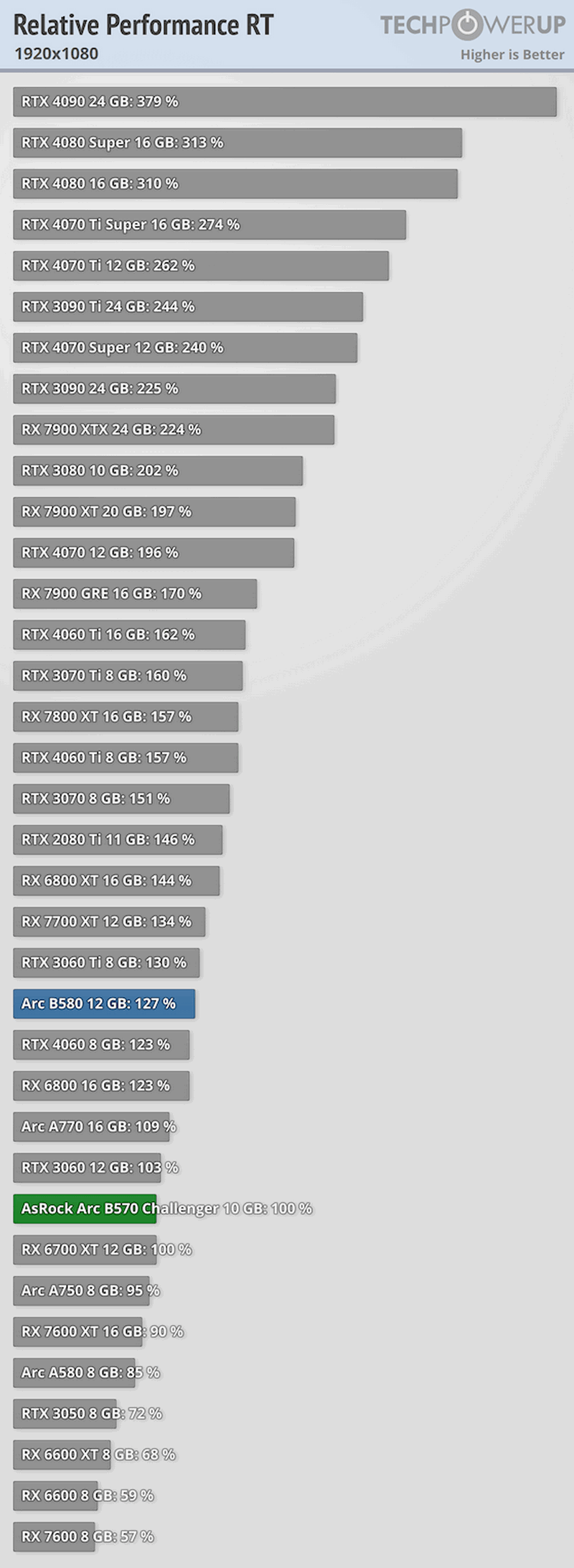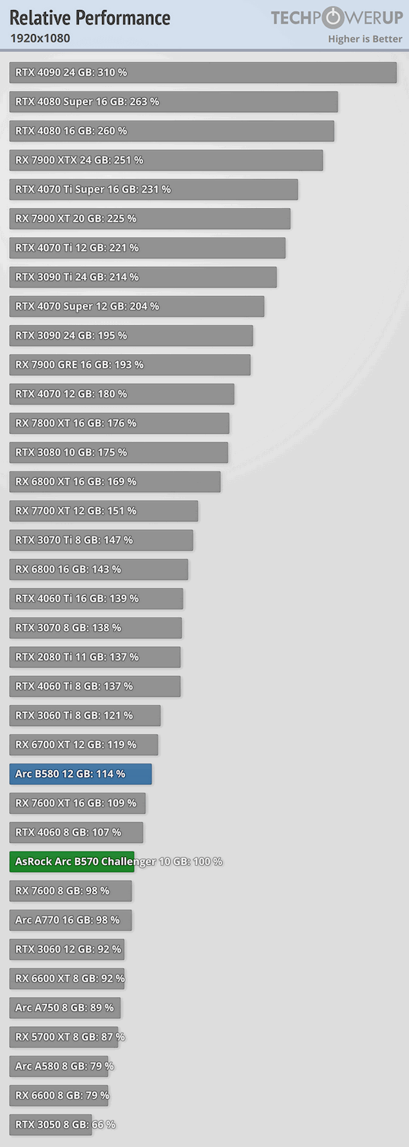Если мы посмотрим на разрешение Full HD, как целевое для такой карты, мы увидим, что Arc B570 на пару процентов быстрее Radeon RX 7600, то есть, если упростить, это равнозначные модели. RTX 4060 быстрее на 7%, что не особо много, но всё же заметно. Также можно видеть, что Arc B570 выступает на уровне Arc A770 — флагмана прошлого поколения, что весьма впечатляет.