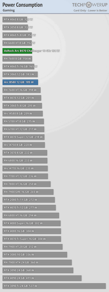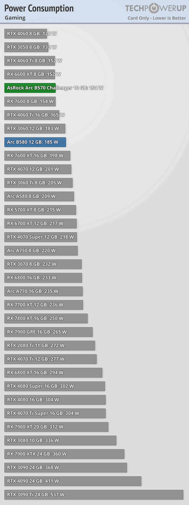 Энергопотребление — не самая сильная сторона как прошлого поколения карт Intel, так и текущего. Arc B570 потребляет немного — всего около 155 Вт, что на уровне RX 7600, но та же RTX 4060 требует всего 130 Вт. Впрочем, в абсолютном выражении разница на самом деле невелика, так что в минусы новинке это записать нельзя.