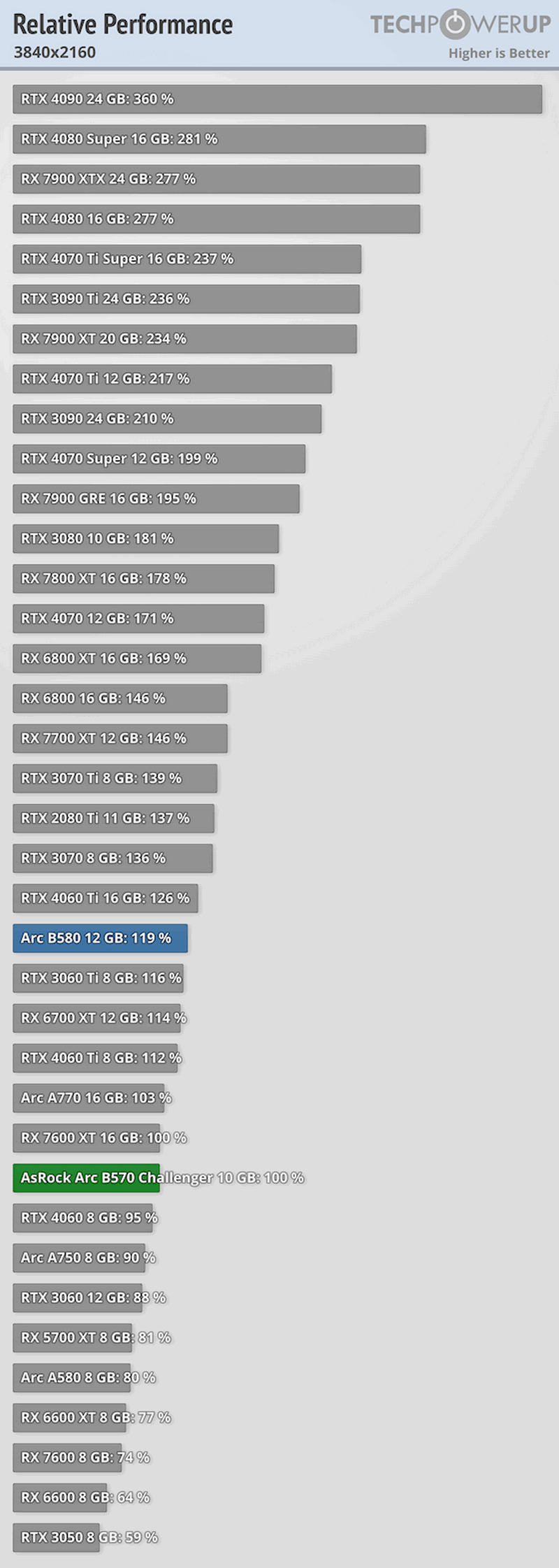 В разрешении 1440p ситуация становится немного лучше для новинки. Она опережает RX 7600 уже на 7% и уменьшает разрыв с RTX 4060. С переходом на 4K новинка Intel уже обходит RTX 4060 на 5%, а RX 7600 — более чем на 20%! Конечно, это нецелевое разрешение для карт данного сегмента, однако есть огромное количество не самых свежих и требовательных игр, где с таким разрешением справится и Arc B570. По итогу можно сказать, что новинка усиливает свои позиции относительно конкурентов с ростом разрешения, а в целом находится на одном уровне с RX 7600 и Arc A770 и немного отстаёт от RTX 4060. Старшая модель Arc B580, к слову, быстрее на 15-20% при примерно такой же надбавке к цене.