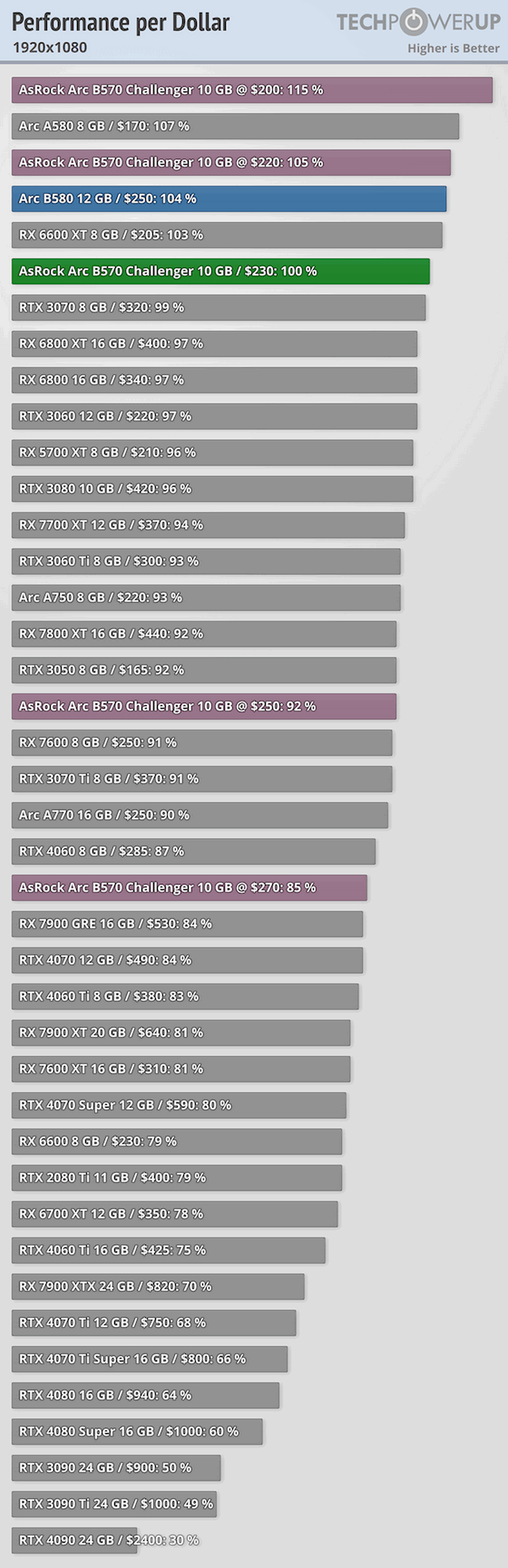 При своей цене в 220 долларов, Arc B570, как и B580 за 250 долларов, является одни из самых выгодных предложений на рынке, а среди актуальных моделей это вообще самые выгодные карты.